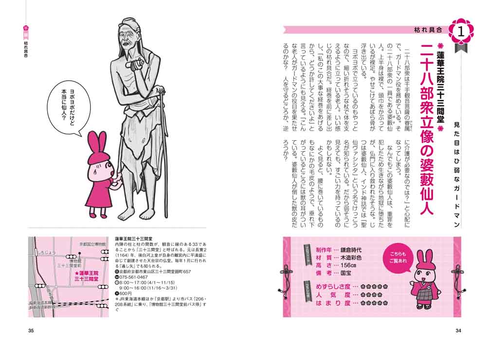 【目次】 うさぎちゃん妄想旅日記 はじめに 索引地図 第1章 顔 ■イケメン・ベスト3 ■美人・ベスト3 ■童顔・ベスト3 ■枯れ具合・ベスト3 ■アフロ・ベスト3 ■頭部だけ・ベスト3 ■ヘアスタイル・ベスト3 ■目が特徴的・ベスト3 ■顔の部分が特徴的ベスト3 [コラム1]次第に広がる仏友の輪 第2章 体 ■ポーズが独特・ベスト3 ■手が千本・ベスト3 ■手が長い・ベスト3 ■裸地蔵・ベスト3 ■でかい仏像・ベスト3 [コラム2]ネットのサークルで会いましょう 第3章 表情 ■微笑み・ベスト3 ■偉そう・ベスト3 ■色っぽい・ベスト3 ■怖い顔・ベスト3 [コラム3]近頃の仏像ブームについて思うこと 第4章 その他 ■なぜ? と思った仏像・ベスト3 ■彫り・ベスト3 ■お腹から顔を出す仏像・ベスト3 ■眺める姿がすてき・ベスト3 [コラム4]私が愛する仏像たち 仏像の見方 仏像のレベル、種類、特徴、印、持物 光背、台座、座法、素材 おわりに |